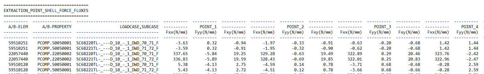 “FXX POINT 1”, “FYY POINT 1”, …, “MXY POINT 1”, “FXX POINT 2”, …: fluxes in each point of the bypass box.