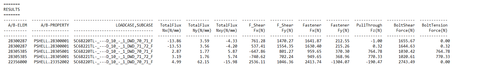 LoadCases(list[N2PLoadCase]): list of load cases that will be analysed. By default, all of them will be analysed. Take note that the load cases must correspond to a model that, when creating the N2PGetFasteners class, has not been yet created (this will be explained in detail later on), so the way of selecting these load cases is not very intuitive. See the previous example.TypeAnalysis(str): type of analysis that will be executed. By default, the “PAG” analysis will be done, but the user could also select the “ALTAIR” analysis.ExportLocation(str): location where results are to be exported. By default, nothing will be exported. Take note that this path should be the folder path, not the (non-existing) file path.TypeExport(str): way in which the results will be exported. By default, the results will be exported in a .txt file. The following exports are supported:“TXT”: two .txt files will be created, one for composite plates and one for metallic plates. The files are similar to the files created by PAG.