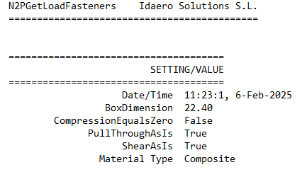 LoadCases(list[N2PLoadCase]): list of load cases that will be analysed. By default, all of them will be analysed. Take note that the load cases must correspond to a model that, when creating the N2PGetFasteners class, has not been yet created (this will be explained in detail later on), so the way of selecting these load cases is not very intuitive. See the previous example.TypeAnalysis(str): type of analysis that will be executed. By default, the “PAG” analysis will be done, but the user could also select the “ALTAIR” analysis.ExportLocation(str): location where results are to be exported. By default, nothing will be exported. Take note that this path should be the folder path, not the (non-existing) file path.TypeExport(str): way in which the results will be exported. By default, the results will be exported in a .txt file. The following exports are supported:“TXT”: two .txt files will be created, one for composite plates and one for metallic plates. The files are similar to the files created by PAG.