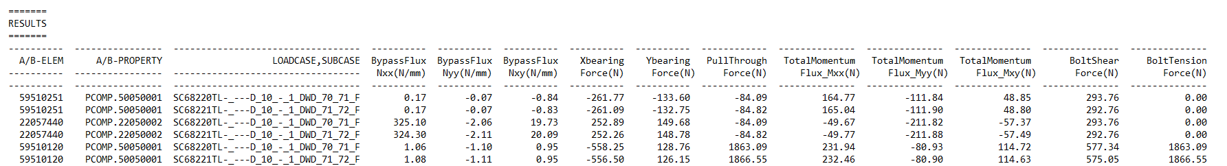 CompressionEqualsZero,ShearAsIs,PullThroughAsIs: it has no effect on performance, but the bearing and shear values will change. For the first attribute, negative pullthrough forces will be set to zero; for the second one, the shear force will not be calculated and instead the force obtained in the results file will be used; and for the last one, the pullthrough force will not be calculated and instead the default value will be used.MaterialFactorMetal,MaterialFactorComposite,AreaFactor: it has no effect on performance, but the bypass values will differ, as they are used to create the bypass box. It is highly recommended that the user leaves these values as they are (especially for a PAG analysis) or just changes theMaterialFactorCompositevalue to 4.5 (for an ALTAIR analysis).ExportPrecision: it has no effect on performance. The only difference is the type of float (with simple or double precision) that will be exported to a HDF5 file.DefaultDiameter: it has no effect on performance. This value will be assigned as diameter to all joints with no diameter in their cards. If this is not present, joints with no diameter will not have their values calculated.MaxIterations: it could have an influence on both the performance and the results, because, if this value is too small, “good” plates will be discarded and their loads not calculated. It is not recommended to change this value, as usually the bypass box will be obtained within a few iterations.ProjectionTolerance: it could have an influence on both the performance and the results, because it has an influence in the determination of wether or not a point belongs to an element. it is not recommended to change this value.CornerData: it has an influence on both the performance and the results obtained. It is recommended to keep this set toFalse, as the other option is significantly more computationally expensive and has not been tested as much, even if it would guarantee a slightly better accuracy.LoadSecondModel: it has an influence on the performance, but not the obtained results. Setting this toTruewould mean that, before obtaining the results, a new model would have to be created and elements would have to be updated, but results would be obtained in less elements. Therefore, the user may want to set this toTrueif obtaining the results takes a very long time compared to the other parts of the method.LoadCaseNumber: it has an influence on the performance, but not the obtained results. Setting this value to an integer N would mean that results are obtained in batches of N, which the user may want to do if the number of load cases to be analysed is very high. The amount that should be set depends mainly on the computer in which the method is ran, and a rough estimate would be 1000.AdjacencyLevel: it has an influence on the performance and it may have an influence on the obtained results. Setting this to an integer N would mean that a new model is created with less elements (which takes time), and some elements have to be updated (which also takes time). However, a model with less elements would mean that obtaining the bypass box and bypass loads take less time, but obtaining the results take more time. Therefore, the user may want to set this to some value if loading results does not take much time, but creating the bypass boxes and/or obtaining the bypass loads do. The value to be set depends on how fine the mesh is, and the user should make sure that a high enough value is set so that all elements within approximately 5 diameters of every bolt are included, with 4 being a good value for most cases. Regarding the accuracy of the results, it is important to note that selecting a value that is too low would mean that some points making up the bypass box would be located outside of the model, giving worse results (as has been explained before).