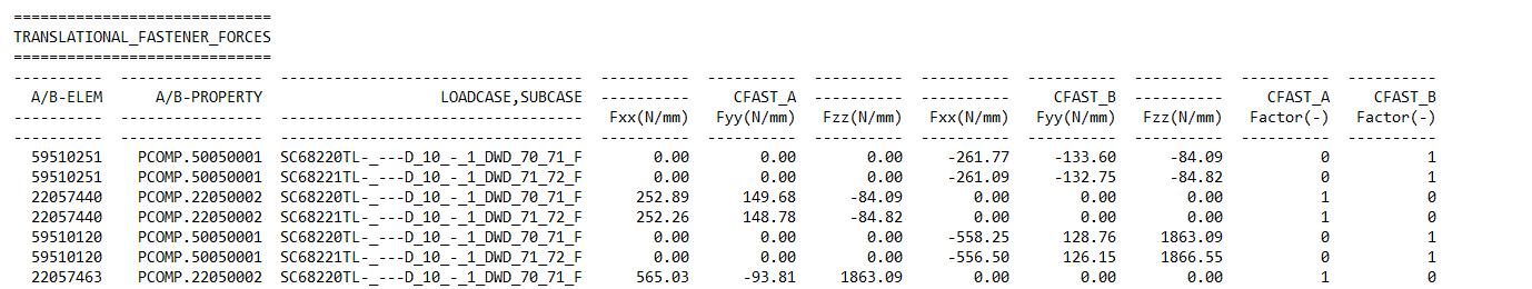 “FXX CFAST A”, “FYY CFAST A”, “FZZ CFAST A”, “FXX CFAST B”, “FYY CFAST B”, “FZZ CFAST B”: translational fastener forces.