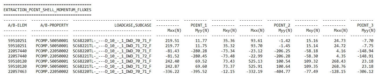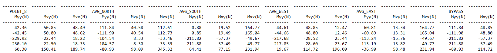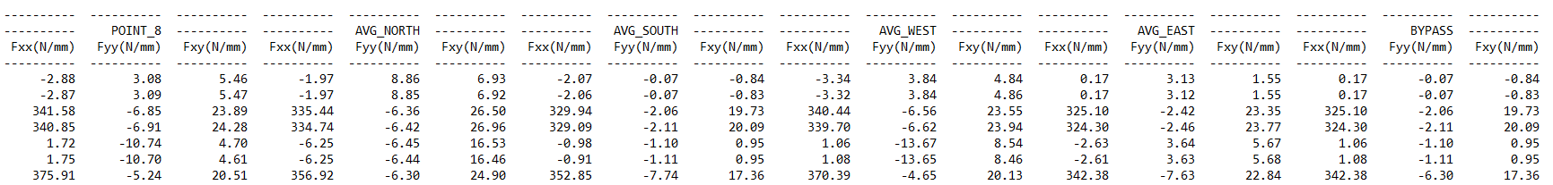 “FXX POINT 1”, “FYY POINT 1”, …, “MXY POINT 1”, “FXX POINT 2”, …: fluxes in each point of the bypass box.