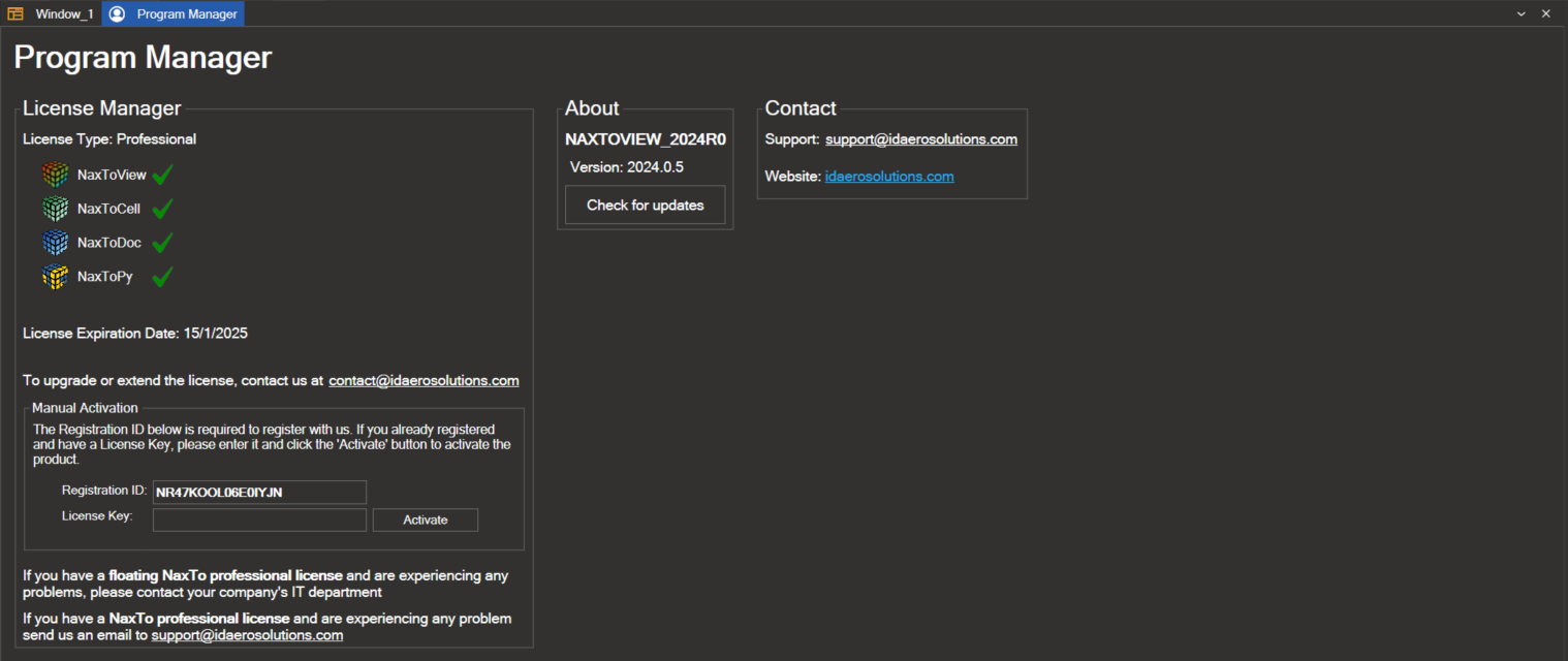 This window displays all information related to Licenses, Contact, Versions, etc.
