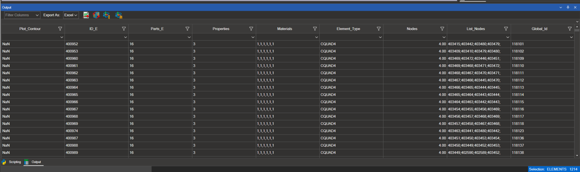 The Output Tool displays information for the selected Elements, Nodes and Coordinate Systems.