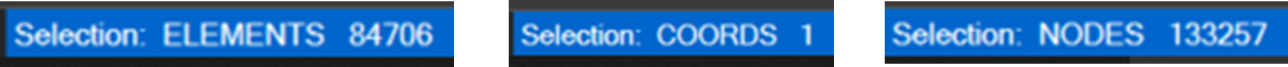 This tool displays the count of selected elements, nodes, and coordinate systems in the FEM analysis model within the 3D window.