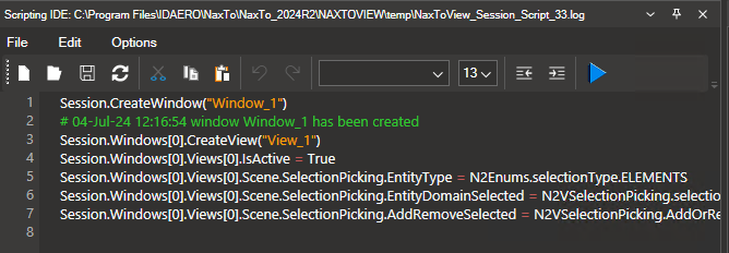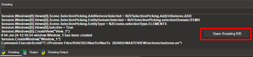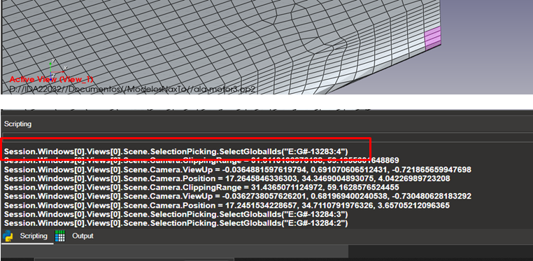 Most actions performed in NaxToView produce the equivalent action in the scripting window. For example, the action of selecting some elements in a model (with Item: Elements selected, shift + hold right click + select elements) automatically outputs a scripting command in the console.