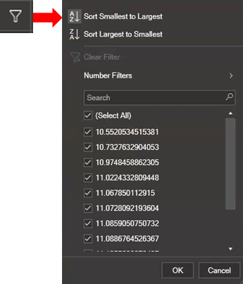 Clicking on the filter icon opens a dropdown menu that allows you to filter by values and sort them in ascending or descending order.